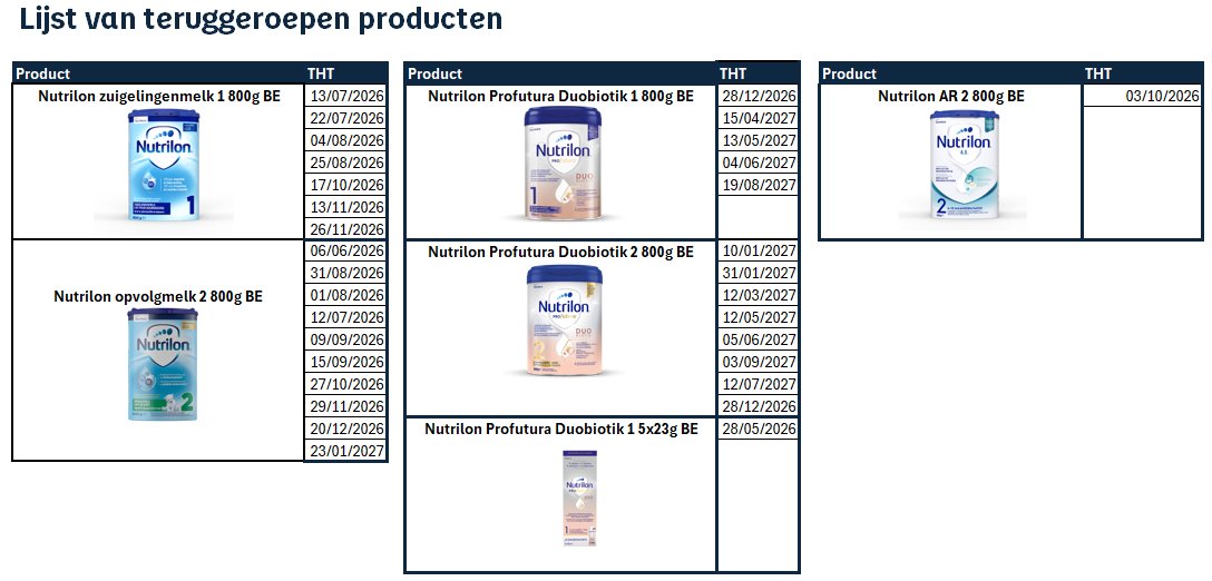Danone heeft, in het licht van de evoluerende richtlijnen van de EU-autoriteiten, waaronder het nieuwe advies van EFSA, in overleg met het FAVV besloten om de vrijwillige en preventieve terugroeping van 23 januari 2026 uit te breiden met de onderstaande batches in België. Deze werden verkocht via verschillende verkooppunten, inclusief supermarkten en apotheken.
